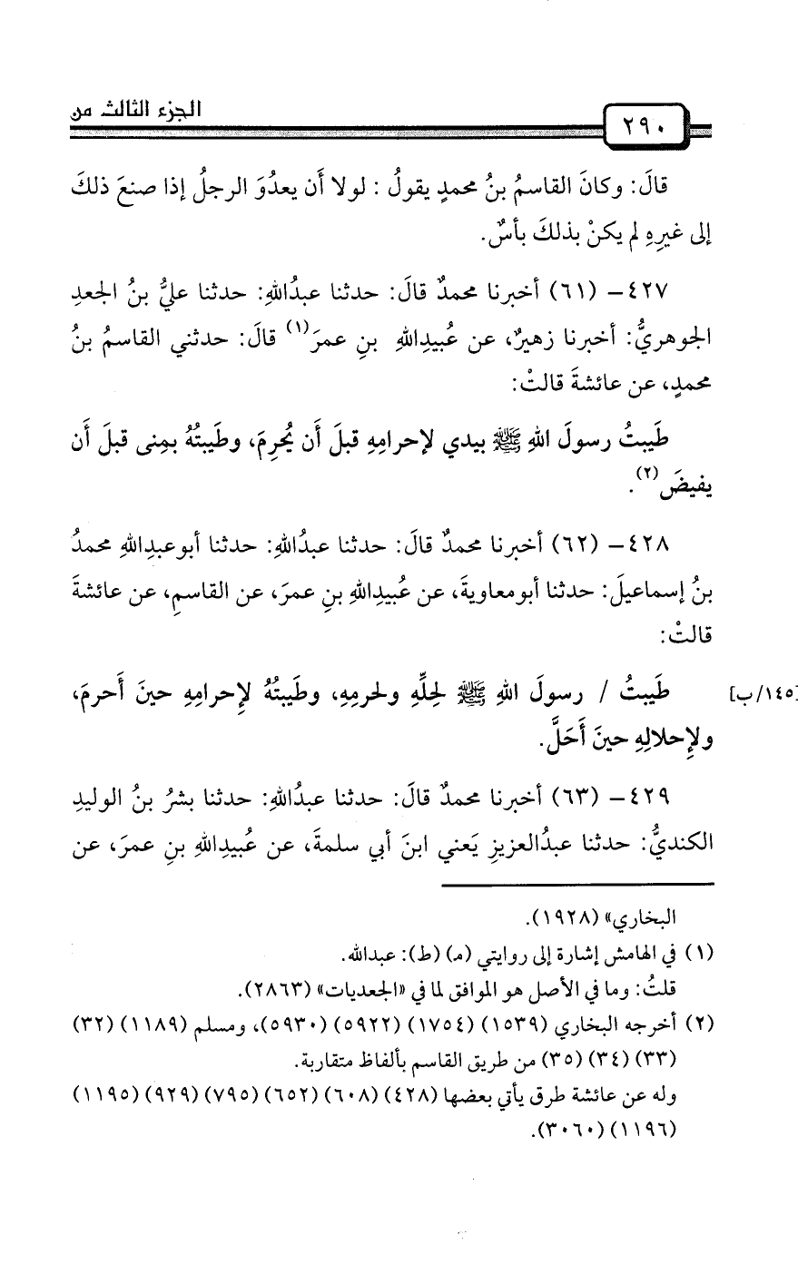 428- (62) أخبرنا محمدٌ قالَ: حدثنا عبدُاللهِ: حدثنا أبوعبدِاللهِ محمدُ بنُ إسماعيلَ: حدثنا أبومعاويةَ، عن عُبيدِاللهِ بنِ عمرَ، عن القاسمِ، عن عائشةَ قالتْ: