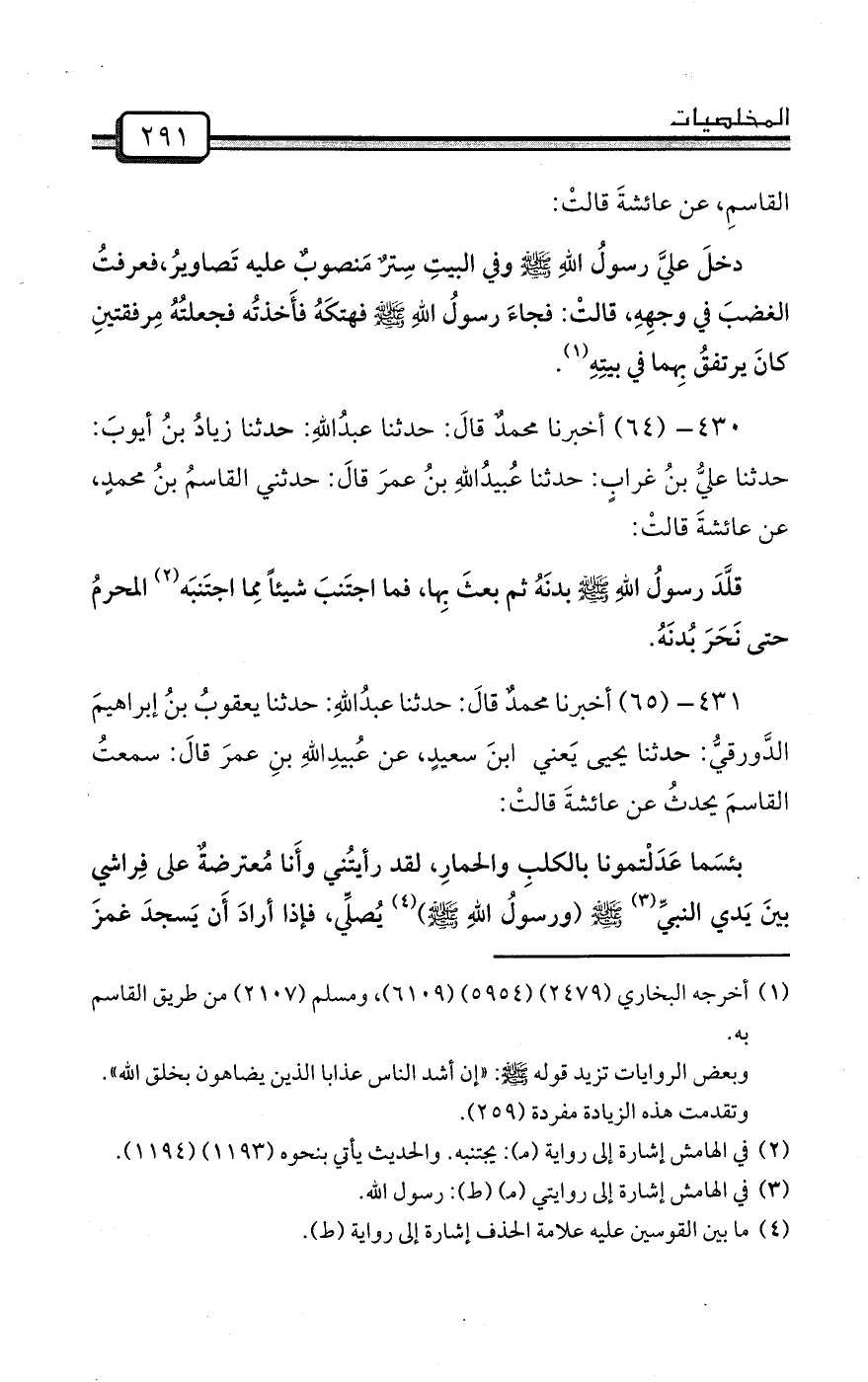 430- (64) أخبرنا محمدٌ قالَ: حدثنا عبدُاللهِ: حدثنا زيادُ بنُ أيوبَ: حدثنا عليُّ بنُ غرابٍ: حدثنا عُبيدُاللهِ بنُ عمرَ قالَ: حدثني القاسمُ بنُ محمدٍ، عن عائشةَ قالتْ: