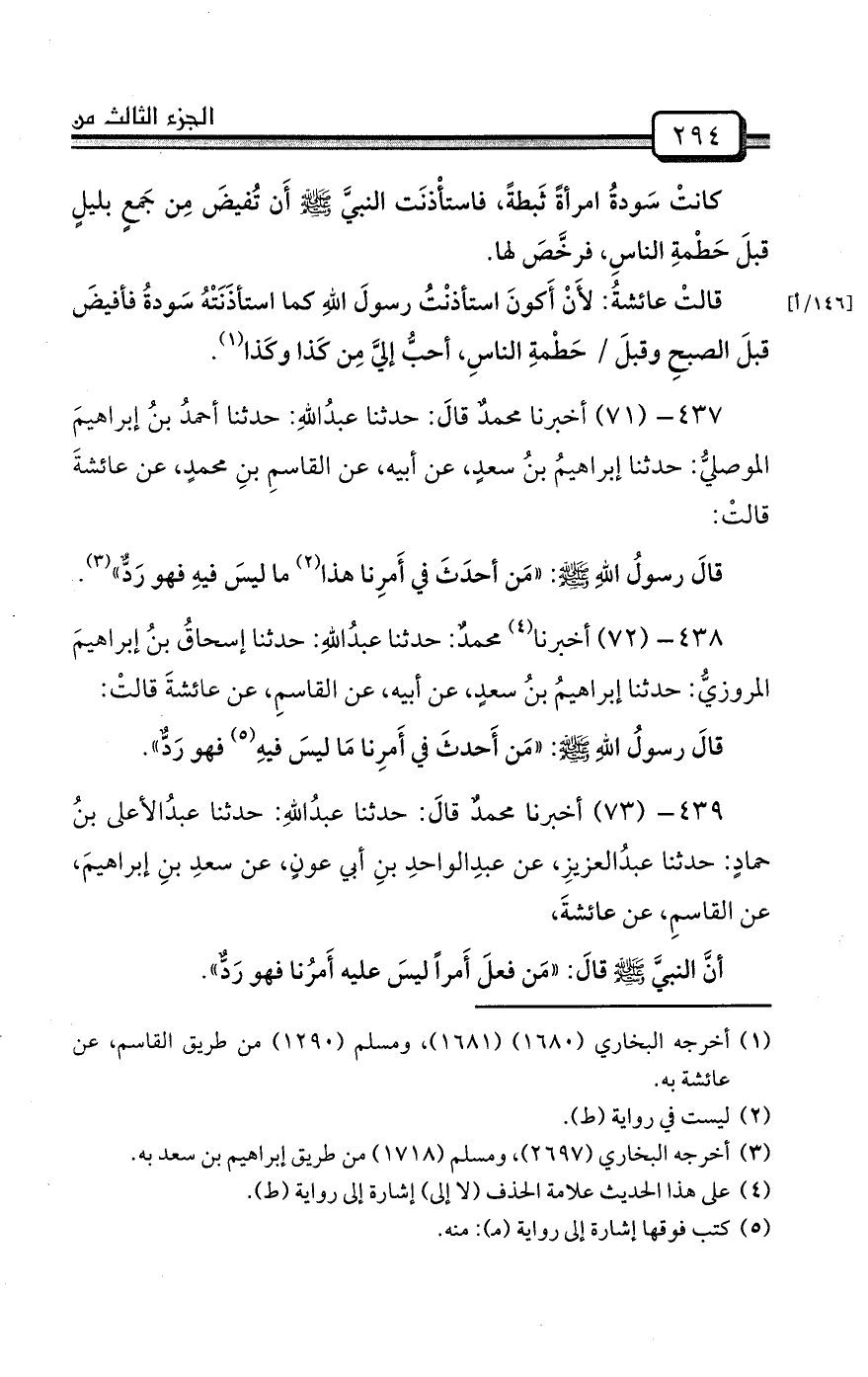 437- (71) أخبرنا محمدٌ قالَ: حدثنا عبدُاللهِ: حدثنا أحمدُ بنُ إبراهيمَ الموصليُّ: حدثنا إبراهيمُ بنُ سعدٍ، عن أبيه، عن القاسمِ بنِ محمدٍ، عن عائشةَ قالتْ: