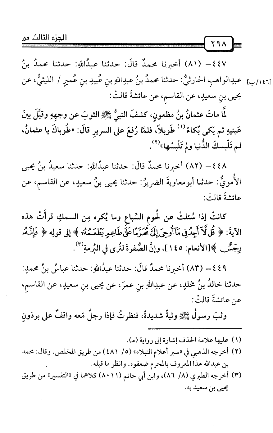 447- (81) أخبرنا محمدٌ قالَ: حدثنا عبدُاللهِ: حدثنا محمدُ بنُ عبدِالواهبِ الحارثيُّ: حدثنا محمدُ بنُ عبدِاللهِ بنِ عُبيدِ بنِ عُميرٍ / الليثيُّ، عن يحيى بنِ سعيدٍ، عن القاسمِ، عن عائشةَ قالتْ: