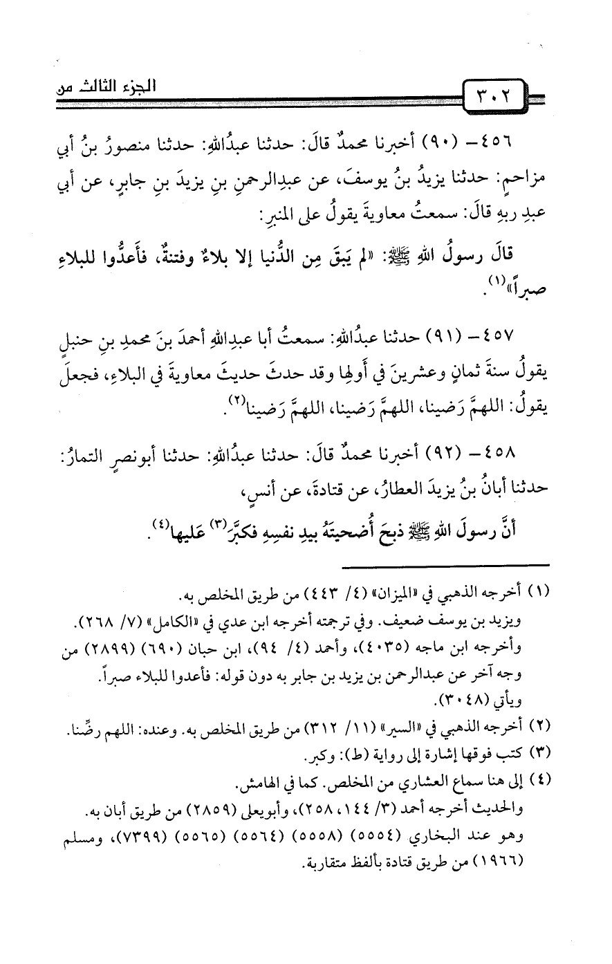 457- (91) حدثنا عبدُاللهِ: سمعتُ أبا عبدِاللهِ أحمدَ بنَ محمدِ بنِ حنبلٍ يقولُ سنةَ ثمانٍ وعشرينَ في أَولِها وقد حدثَ حديثَ معاويةَ في البلاءِ، فجعلَ يقولُ: اللهمَّ رَضينا، اللهمَّ رَضينا، اللهمَّ رَضينا (¬2) .