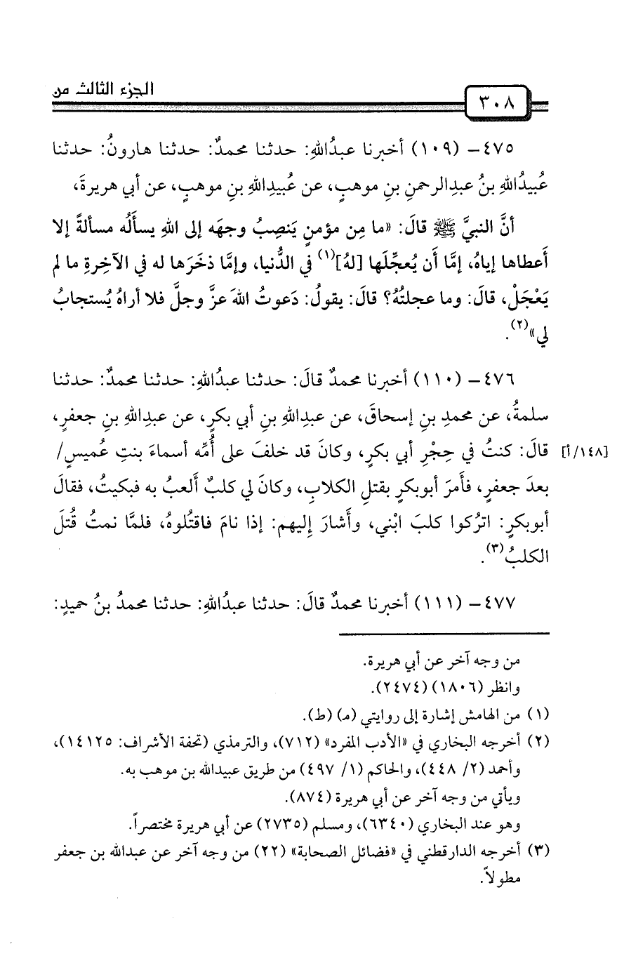 477- (111) أخبرنا محمدٌ قالَ: حدثنا عبدُاللهِ: حدثنا محمدُ بنُ حميدٍ: