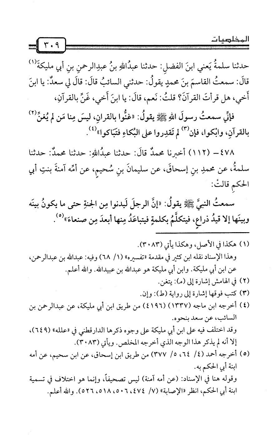حدثنا سلمةُ يَعني ابنَ الفضلِ: حدثنا عبدُاللهِ بنُ عبدِالرحمنِ بنِ أبي مليكةَ (¬1) قالَ: سمعتُ القاسمَ بنَ محمدٍ يقولُ: حدثني السائبُ قالَ: قالَ لي سعدٌ: يا ابنَ أَخي، هل قرأتَ القرآنَ؟ قلتُ: نَعم، قالَ: يا ابنَ أَخي، غَنِّ بالقرآنِ،