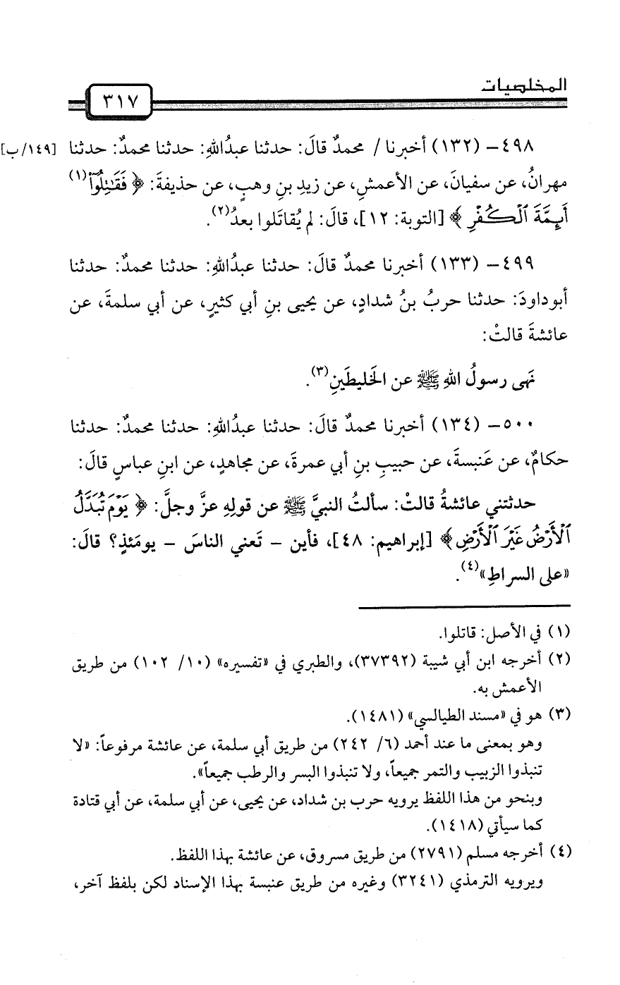 500- (134) أخبرنا محمدٌ قالَ: حدثنا عبدُاللهِ: حدثنا محمدٌ: حدثنا حكامٌ، عن عَنبسةَ، عن حبيبِ بنِ أبي عمرةَ، عن مجاهدٍ، عن ابنِ عباسٍ قالَ: