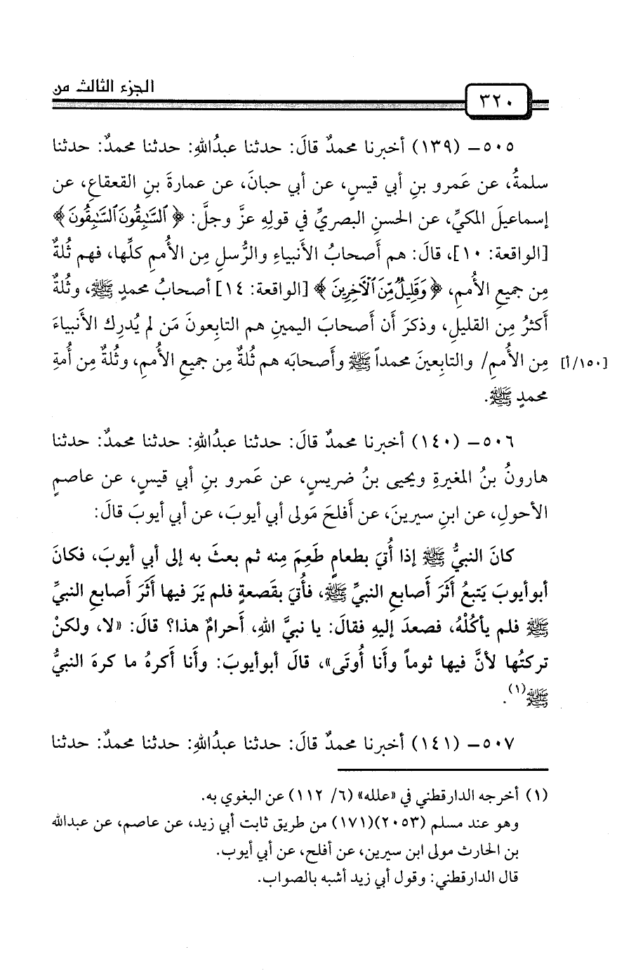 505- (139) أخبرنا محمدٌ قالَ: حدثنا عبدُاللهِ: حدثنا محمدٌ: حدثنا سلمةُ، عن عَمرو بنِ أبي قيسٍ، عن أبي حبانَ، عن عمارةَ بنِ القعقاعِ، عن إسماعيلَ المكيِّ، عن الحسنِ البصريِّ في قولِهِ عزَّ وجلَّ: {السَّابِقُونَ السَّابِقُون} [الواقعة: 10] ، قالَ: هم أَصحابُ الأَنبياءِ والرُّسلِ مِن الأُممِ كلِّها، فهم ثُلةٌ مِن جميعِ الأُممِ، {وَقَلِيلٌ مِّنَ الآخِرِين} [الواقعة: 14] أصحابُ محمدٍ صلى الله عليه وسلم، وثُلةٌ أَكثرُ مِن القليلِ، وذكرَ أَن أَصحابَ اليمينِ هم التابِعونَ مَن لم يُدرِك الأَنبياءَ مِن الأُممِ/ والتابِعينَ محمداً صلى الله عليه وسلم وأَصحابَه هم ثُلةٌ مِن جميعِ الأُممِ، وثُلةٌ مِن أُمةِ محمدٍ صلى الله عليه وسلم.