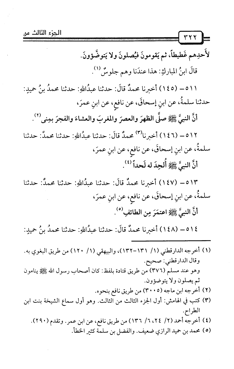 511- (145) أخبرنا محمدٌ قالَ: حدثنا عبدُاللهِ: حدثنا محمدُ بنُ حميدٍ: حدثنا سلمةُ، عن ابنِ إسحاقَ، عن نافعٍ، عن ابنِ عمرَ،