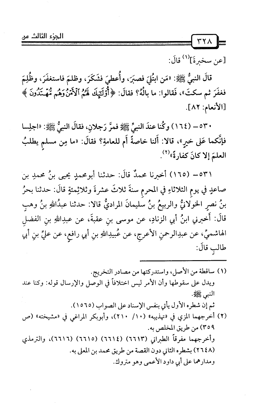 530- (164) وكُنا عندَ النبيِّ صلى الله عليه وسلم فمرَّ رَجلانِ، فقالَ النبيُّ صلى الله عليه وسلم: «اجلِسا فإنَّكما عَلى خيرٍ» ، قالا: أَلنا خاصةً أَم للعامةِ؟ فقالَ: «ما مِن مسلمٍ يطلبُ العلمَ إلا كانَ كفارةً» (¬2) .