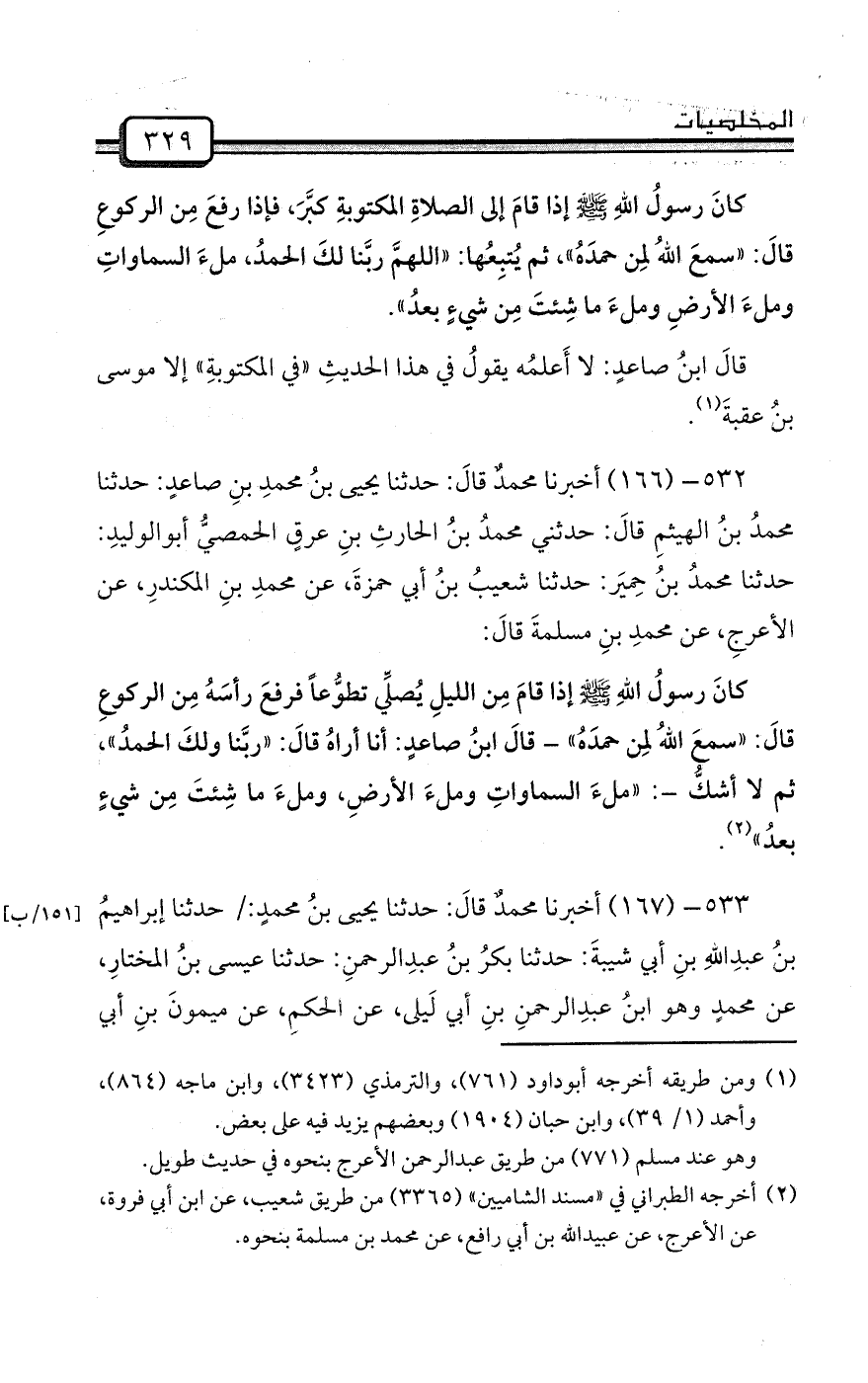 كانَ رسولُ اللهِ صلى الله عليه وسلم إذا قامَ مِن الليلِ يُصلِّي تطوُّعاً فرفعَ رأسَهُ مِن الركوعِ قالَ: «سمعَ اللهُ لِمن حمدَهُ» - قالَ ابنُ صاعدٍ: أنا أراهُ قالَ: «ربَّنا ولكَ الحمدُ» ، ثم لا أشكُّ -: «ملءَ السماواتِ وملءَ الأرضِ، وملءَ ما شِئتَ مِن شيءٍ بعدُ» (¬2) .