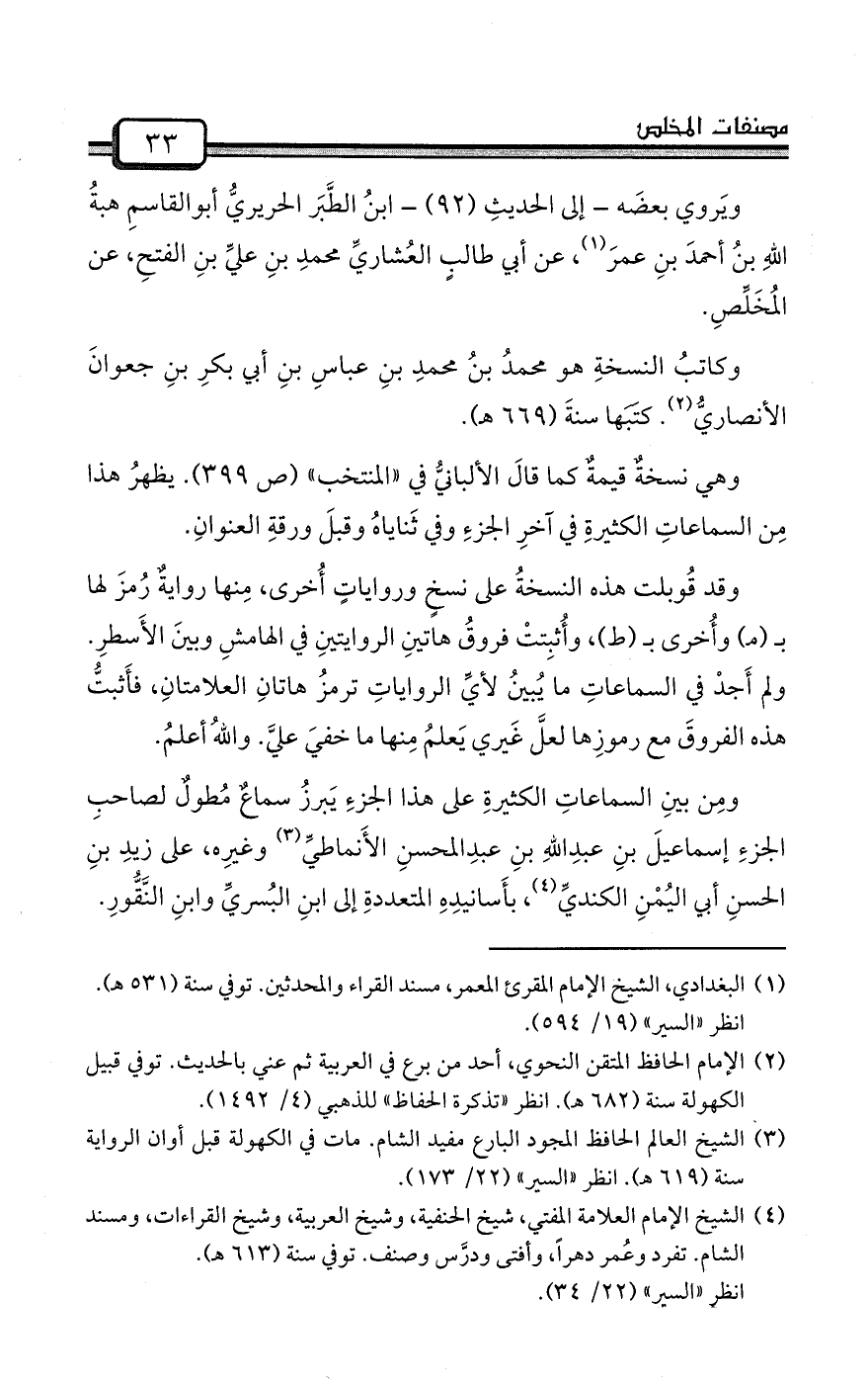 ويَروي بعضَه - إلى الحديثِ (92) - ابنُ الطَّبَر الحريريُّ أبوالقاسمِ هبةُ اللهِ بنُ أحمدَ بنِ عمرَ (¬1) ، عن أبي طالبٍ العُشاريِّ محمدِ بنِ عليِّ بنِ الفتحِ، عن المُخَلِّصِ.