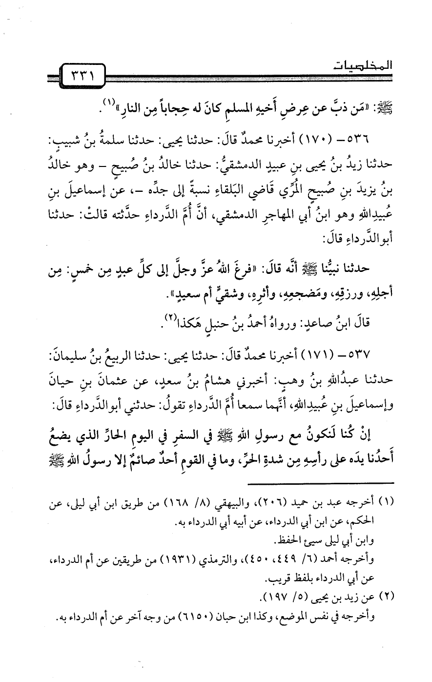536- (170) أخبرنا محمدٌ قالَ: حدثنا يحيى: حدثنا سلمةُ بنُ شبيبٍ: حدثنا زيدُ بنُ يحيى بنِ عبيدٍ الدمشقيُّ: حدثنا خالدُ بنُ صُبيحٍ - وهو خالدُ بنُ يزيدَ بنِ صُبيحٍ المُرِّي قَاضي البَلقاءِ نسبةً إلى جدِّه -، عن إسماعيلَ بنِ عُبيدِاللهِ وهو ابنُ أبي المهاجرِ الدمشقي، أنَّ أُمَّ الدَّرداءِ حدَّثته قالتْ: حدثنا أبوالدَّرداءِ قالَ: