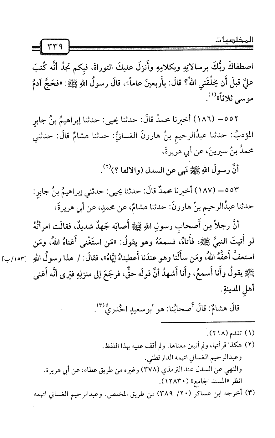 552- (186) أخبرنا محمدٌ قالَ: حدثنا يحيى: حدثنا إبراهيمُ بنُ جابرٍ المؤدبُ: حدثنا عبدُالرحيمِ بنُ هارونَ الغسانيُّ: حدثنا هشامٌ قالَ: حدثني محمدُ بنُ سيرينَ، عن أبي هريرةَ،