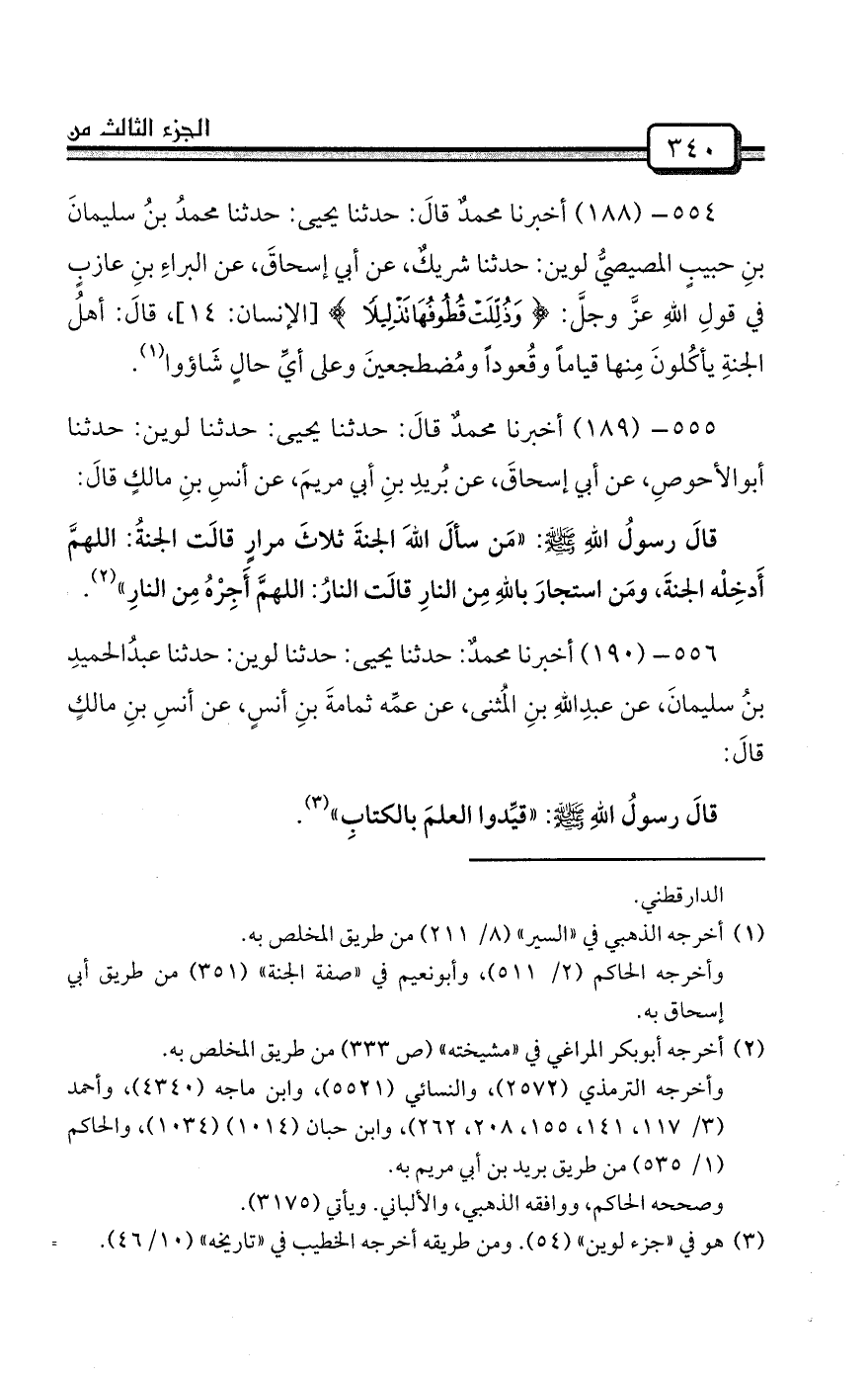 555- (189) أخبرنا محمدٌ قالَ: حدثنا يحيى: حدثنا لوين: حدثنا أبوالأحوصِ، عن أبي إسحاقَ، عن بُريدِ بنِ أبي مريمَ، عن أنسِ بنِ مالكٍ قالَ: