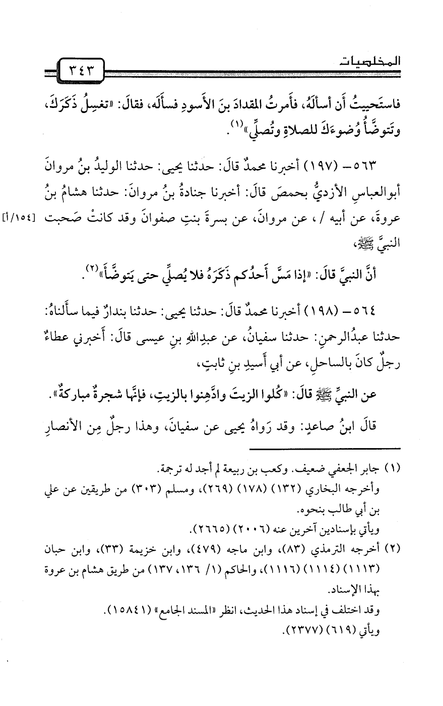 563- (197) أخبرنا محمدٌ قالَ: حدثنا يحيى: حدثنا الوليدُ بنُ مروانَ أبوالعباسِ الأزديُّ بحمصَ قالَ: أخبرنا جنادةُ بنُ مروانَ: حدثنا هشامُ بنُ عروةَ، عن أبيه /، عن مروانَ، عن بسرةَ بنتِ صفوانَ وقد كانتْ صَحبت النبيَّ صلى الله عليه وسلم،