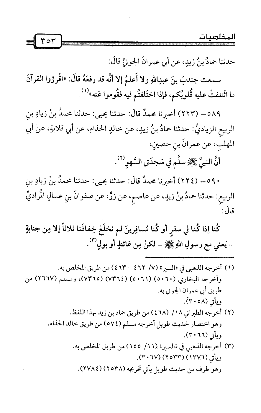 589- (223) أخبرنا محمدٌ قالَ: حدثنا يحيى: حدثنا محمدُ بنُ زيادِ بنِ الربيعِ الزياديُّ: حدثنا حمادُ بنُ زيدٍ، عن خالدٍ الحذاءِ، عن أبي قلابةِ، عن أبي المهلبِ، عن عمرانَ بنِ حصينٍ،