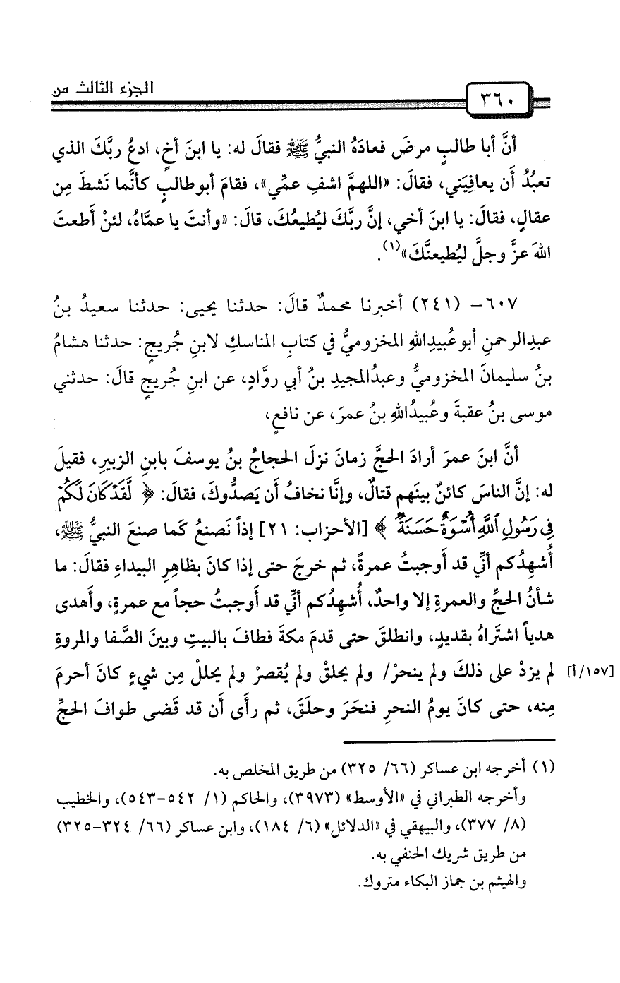 607- (241) أخبرنا محمدٌ قالَ: حدثنا يحيى: حدثنا سعيدُ بنُ عبدِالرحمنِ أبوعُبيدِاللهِ المخزوميُّ في كتابِ المناسكِ لابنِ جُريجٍ: حدثنا هشامُ بنُ سليمانَ المخزوميُّ وعبدُالمجيدِ بنُ أبي روَّادٍ، عن ابنِ جُريجٍ قالَ: حدثني موسى بنُ عقبةَ وعُبيدُاللهِ بنُ عمرَ، عن نافعٍ،