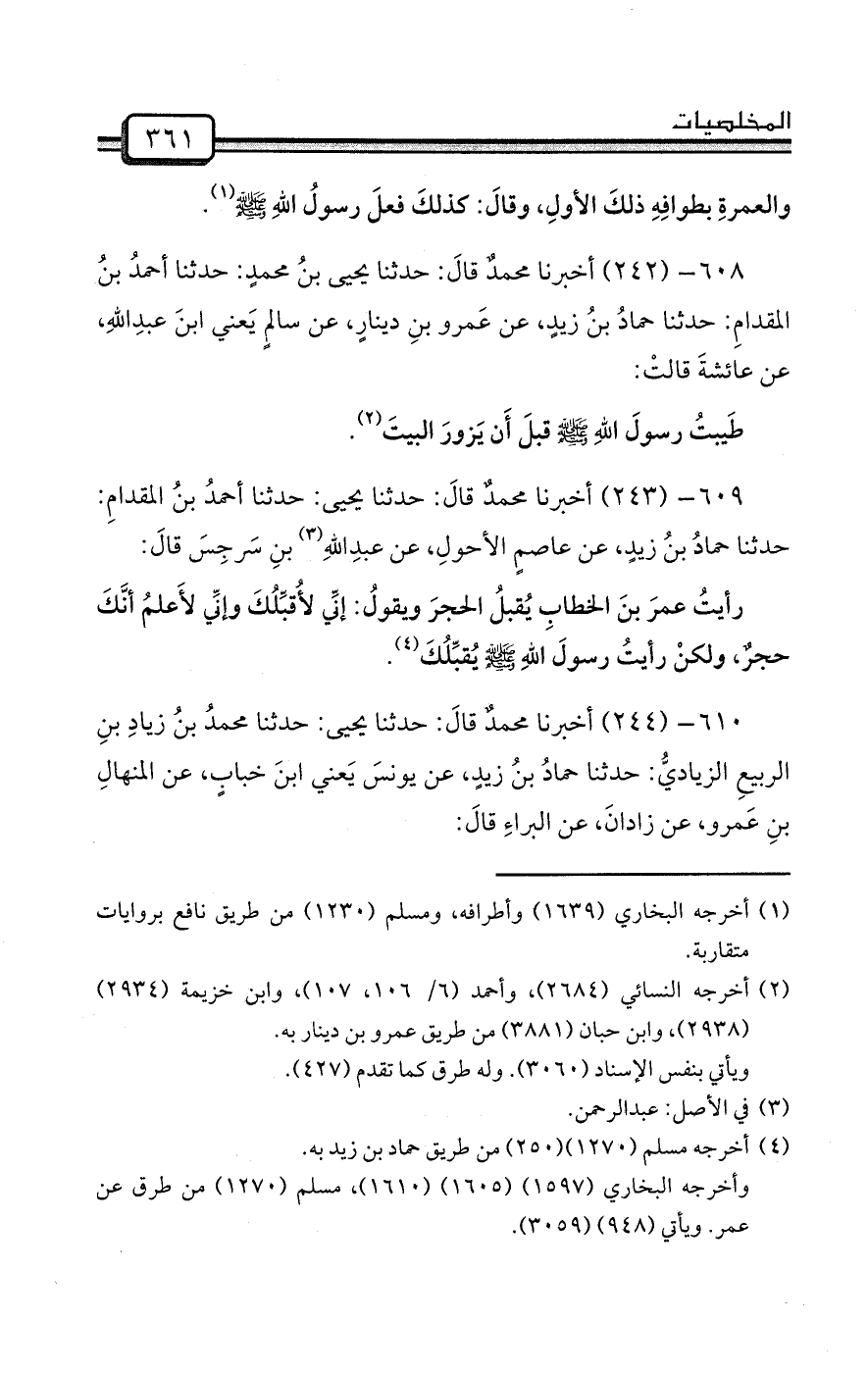 608- (242) أخبرنا محمدٌ قالَ: حدثنا يحيى بنُ محمدٍ: حدثنا أحمدُ بنُ المقدامِ: حدثنا حمادُ بنُ زيدٍ، عن عَمرو بنِ دينارٍ، عن سالمٍ يَعني ابنَ عبدِاللهِ، عن عائشةَ قالتْ: