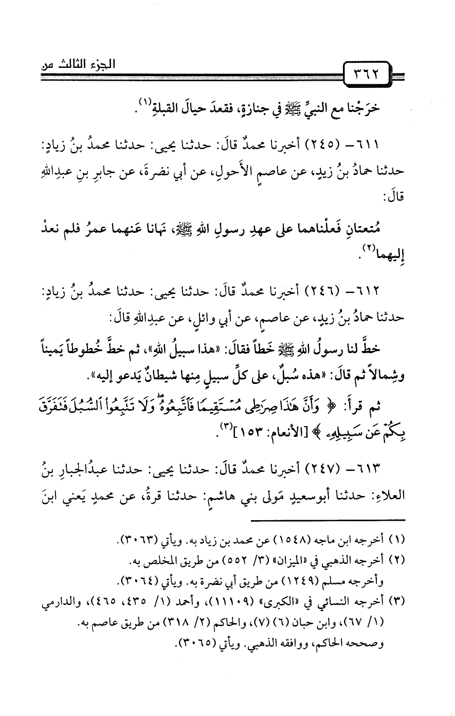 611- (245) أخبرنا محمدٌ قالَ: حدثنا يحيى: حدثنا محمدُ بنُ زيادٍ: حدثنا حمادُ بنُ زيدٍ، عن عاصمٍ الأَحولِ، عن أبي نضرةَ، عن جابرِ بنِ عبدِاللهِ قالَ: