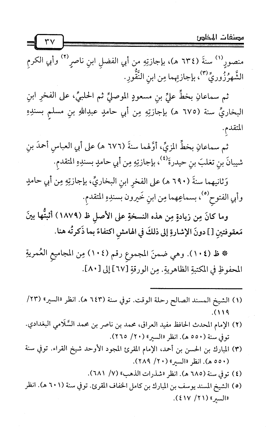 منصورٍ (¬1) سنةَ (634 هـ) ، بإجازتِهِ من أبي الفضلِ ابنِ ناصرٍ (¬2) وأبي الكرمِ الشَّهرُزُوريِّ (¬3) ، بإجازتِهما مِن ابنِ النَّقُّورِ.