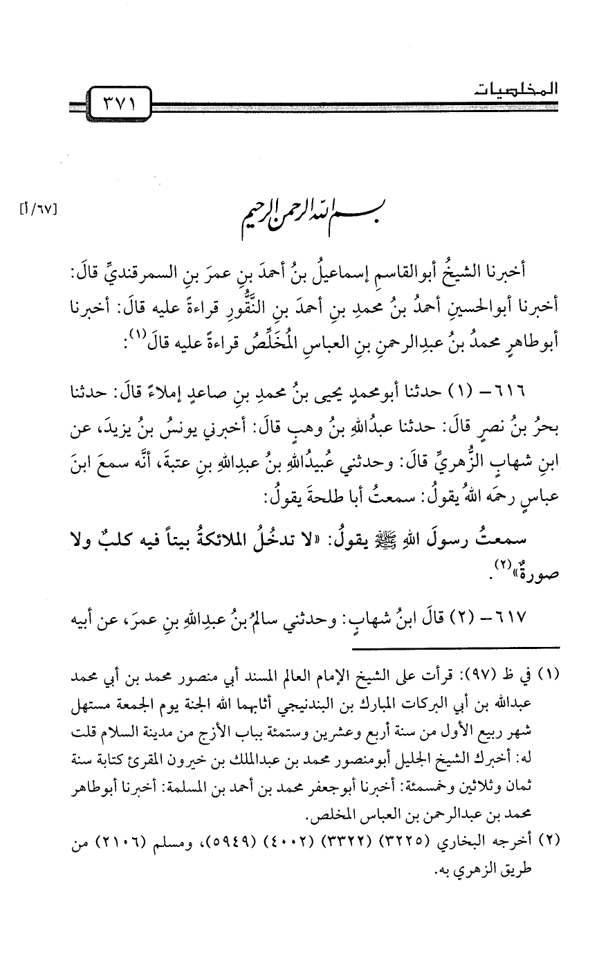 أخبرنا الشيخُ أبوالقاسمِ إسماعيلُ بنُ أحمدَ بنِ عمرَ بنِ السمرقنديِّ قالَ: أخبرنا أبوالحسينِ أحمدُ بنُ محمدِ بنِ أحمدَ بنِ النَّقُّورِ قراءةً عليه قالَ: أخبرنا أبوطاهرٍ محمدُ بنُ عبدِالرحمنِ بنِ العباسِ المُخَلِّصُ قراءةً عليه قالَ (¬1) :