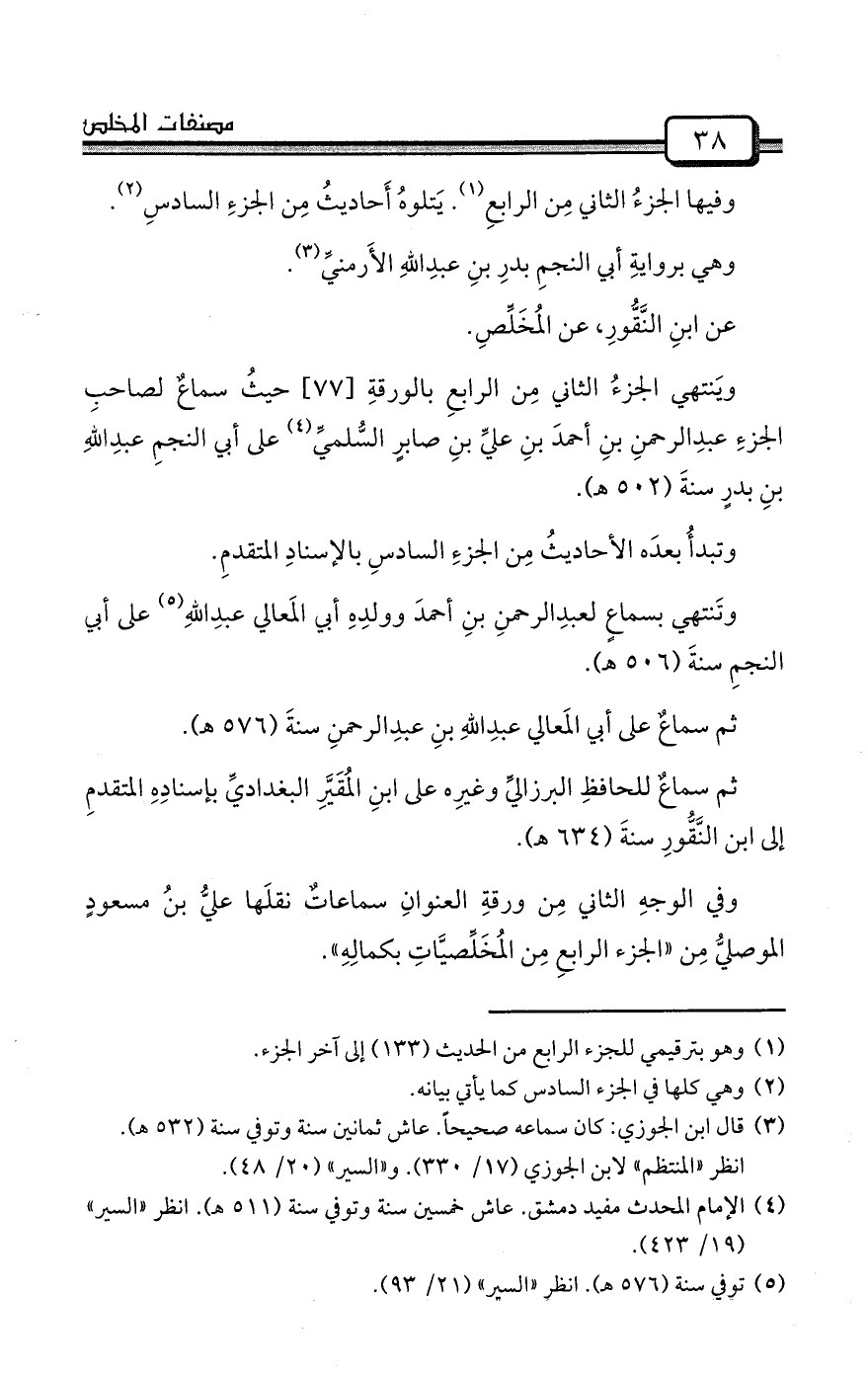 ويَنتهي الجزءُ الثاني مِن الرابعِ بالورقةِ [77] حيثُ سماعٌ لصاحبِ الجزءِ عبدِالرحمنِ بنِ أحمدَ بنِ عليِّ بنِ صابرٍ السُّلميِّ (¬4) على أبي النجمِ عبدِاللهِ بنِ بدرٍ سنةَ (502 هـ) .