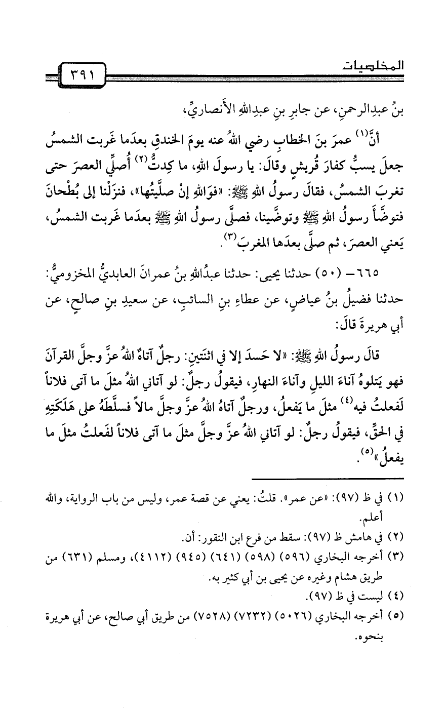 قالَ رسولُ اللهِ صلى الله عليه وسلم: «لا حَسدَ إلا في اثنَتينِ: رجلٌ آتاهٌ اللهُ عزَّ وجلَّ القرآنَ فهو يَتلوهُ آناءَ الليلِ وآناءَ النهارِ، فيقولُ رجلٌ: لو آتاني اللهُ مثلَ ما آتى فلاناً لَفعلتُ فيه (¬4) مثلَ ما يَفعلُ، ورجلٌ آتاهُ اللهُ عزَّ وجلَّ مالاً فسلَّطَهُ على هَلَكَتِهِ في الحقِّ، فيقولُ رجلٌ: لو آتاني اللهُ عزَّ وجلَّ مثلَ ما آتى فلاناً لفَعلتُ مثلَ ما يفعلُ» (¬5) .