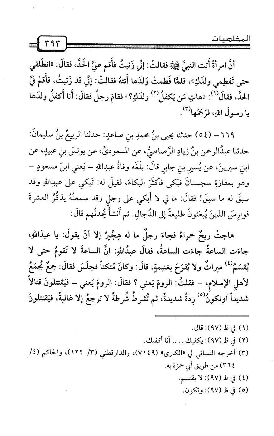 669- (54) حدثنا يحيى بنُ محمدِ بنِ صاعدٍ: حدثنا الربيعُ بنُ سليمانَ: حدثنا عبدُالرحمن بنُ زيادٍ الرَّصاصيُّ، عن المسعوديِّ، عن يونسَ بنِ عبيدٍ، عن ابنِ سيرينَ، عن يُسيرِ بنِ جابرٍ قالَ: بلَغَه وفاةُ عبدِاللهِ - يَعني ابنَ مسعودٍ - وهو بمفازةِ سجستانَ فبَكى فأكثَرَ البكاءَ، فقيلَ له: تَبكي على عبدِاللهِ وقد سبقَ له ما سبقَ! فقالَ: ما لي لا أَبكي على رجلٍ وقد سمعتُهُ يذكُرُ العشرةَ فوارِسَ الذينَ يُبعَثونَ طليعةً إلى الدِّجالِ. ثم أَنشأَ يُحدثُهم قالَ: