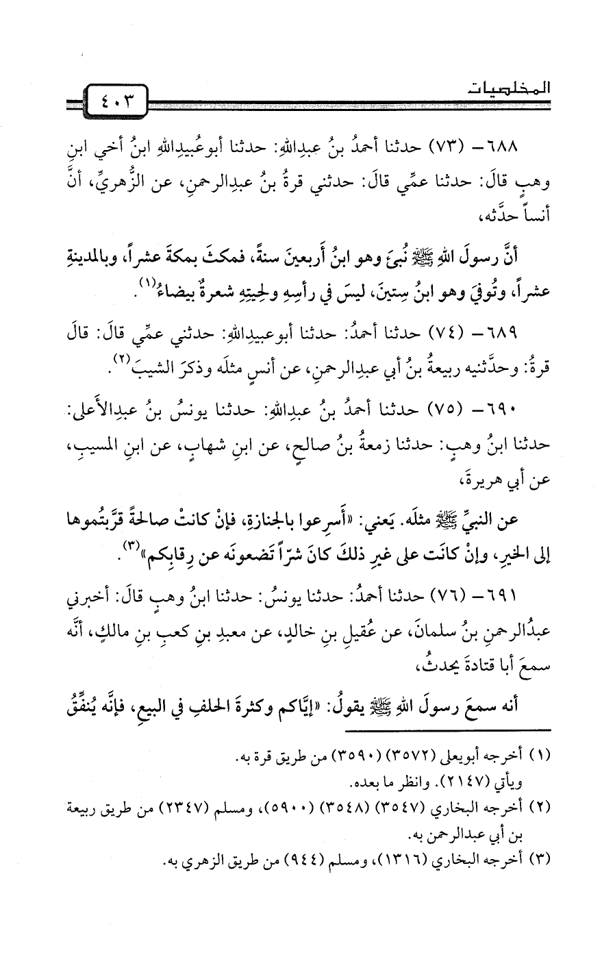 688- (73) حدثنا أحمدُ بنُ عبدِاللهِ: حدثنا أبوعُبيدِاللهِ ابنُ أخي ابنِ وهبٍ قالَ: حدثنا عمِّي قالَ: حدثني قرةُ بنُ عبدِالرحمنِ، عن الزُّهريِّ، أنَّ أنساً حدَّثه،