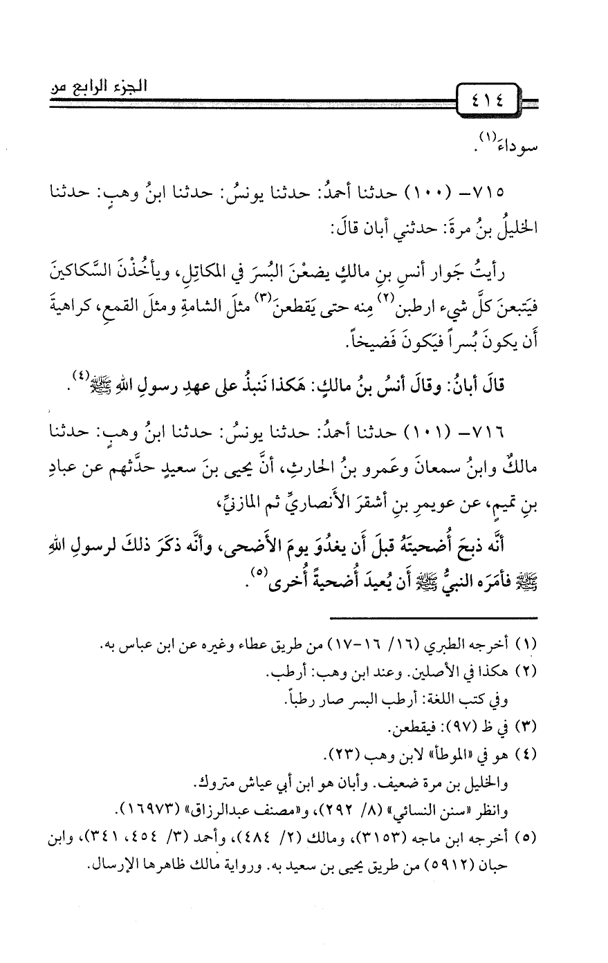 715- (100) حدثنا أحمدُ: حدثنا يونسُ: حدثنا ابنُ وهبٍ: حدثنا الخليلُ بنُ مرةَ: حدثني أبان قالَ: