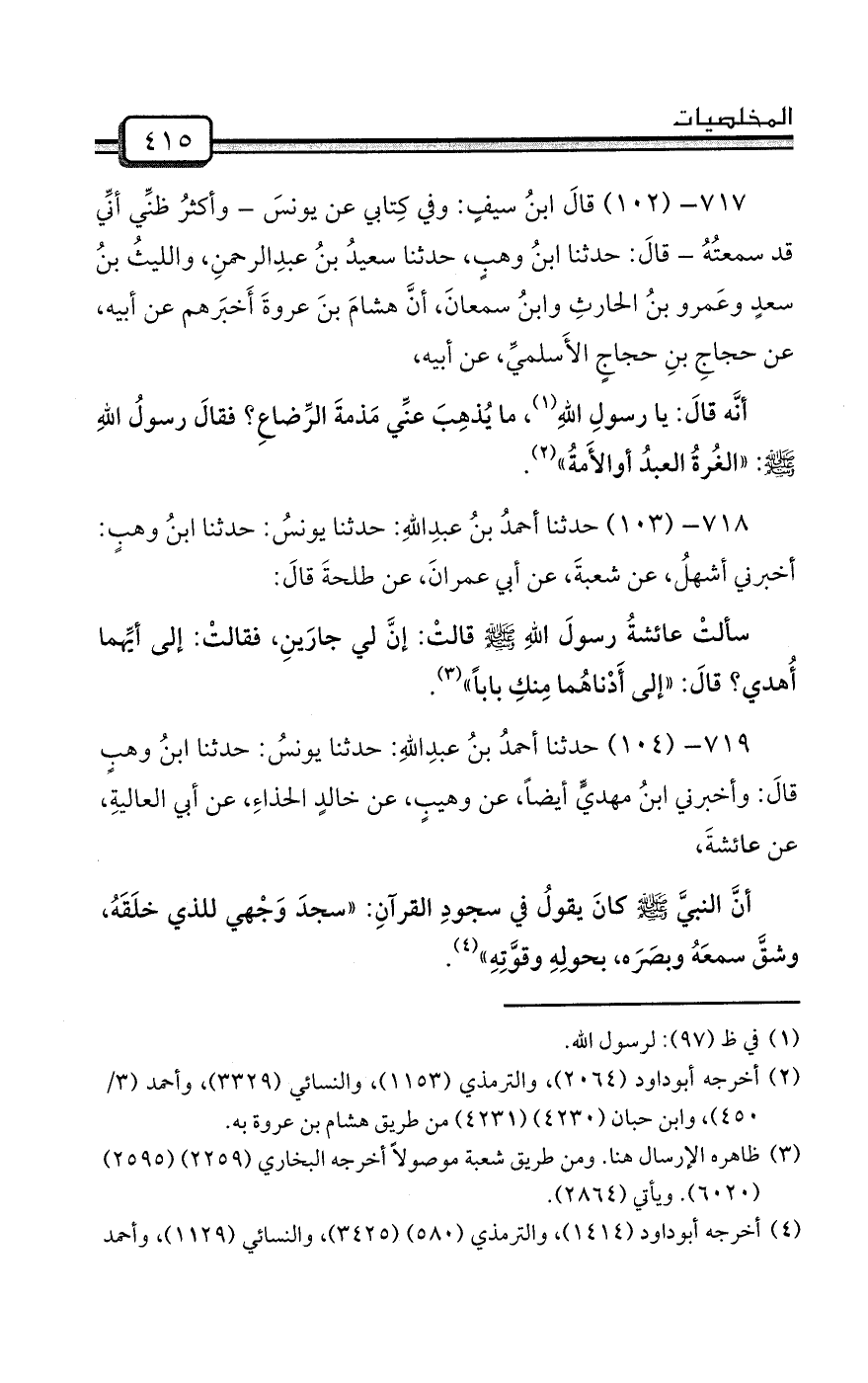 719- (104) حدثنا أحمدُ بنُ عبدِاللهِ: حدثنا يونسُ: حدثنا ابنُ وهبٍ قالَ: وأخبرني ابنُ مهديٍّ أيضاً، عن وهيبٍ، عن خالدٍ الحذاءِ، عن أبي العاليةِ، عن عائشةَ،