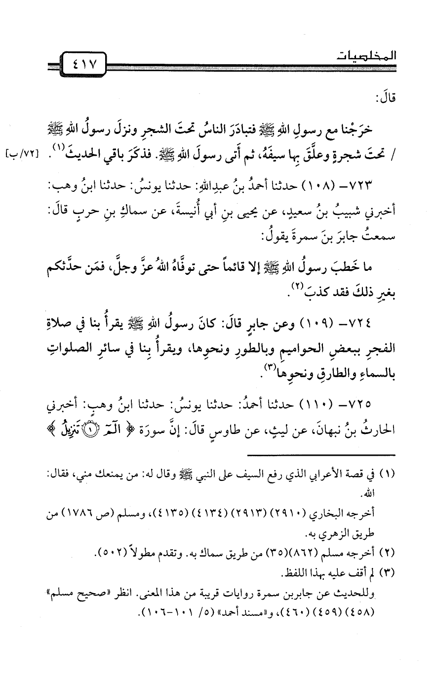 723- (108) حدثنا أحمدُ بنُ عبدِاللهِ: حدثنا يونسُ: حدثنا ابنُ وهب: أخبرني شبيبُ بنُ سعيدٍ، عن يحيى بنِ أبي أُنيسةَ، عن سماكِ بنِ حربٍ قالَ: سمعتُ جابرَ بنَ سمرةَ يقولُ: