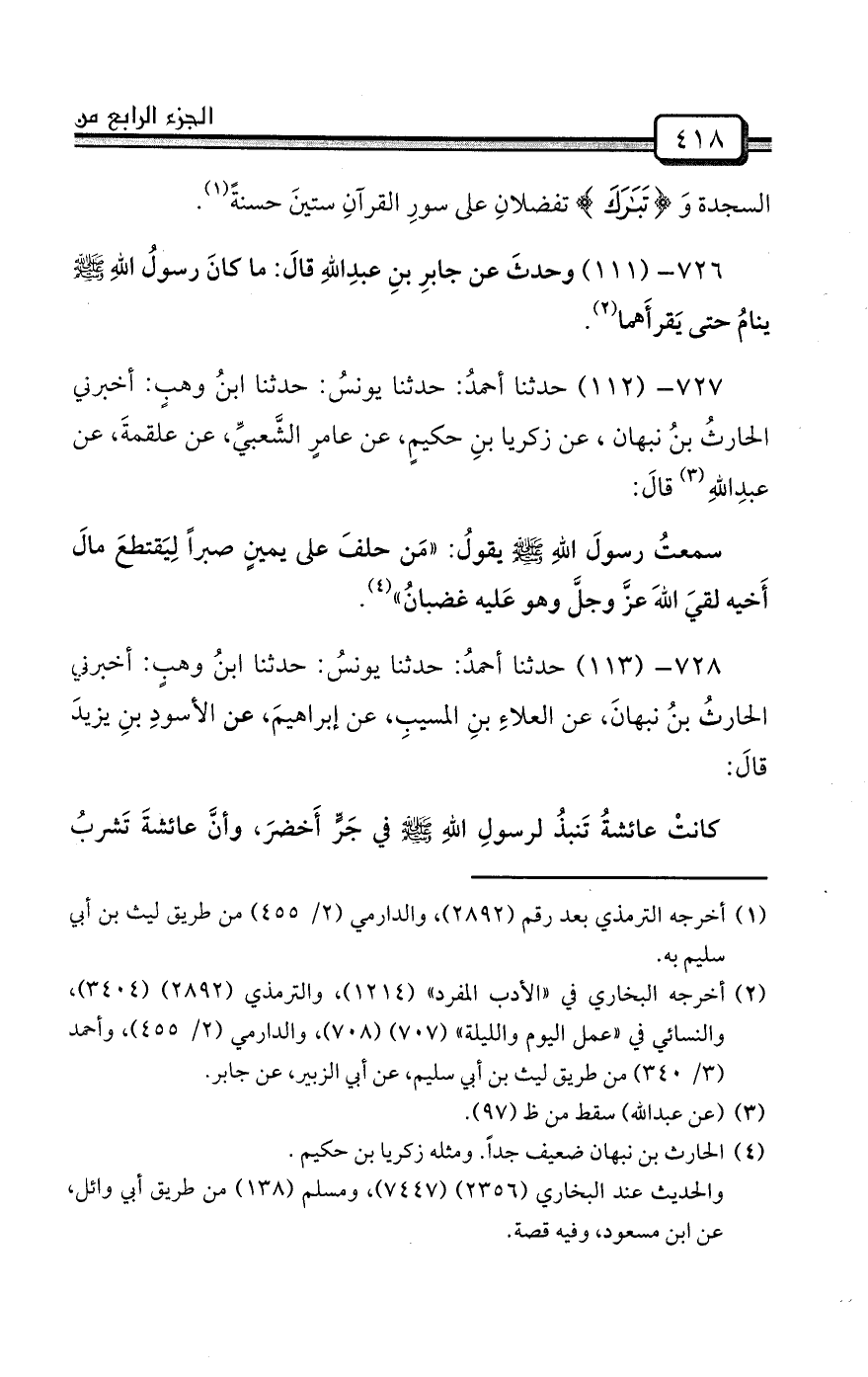 726- (111) وحدثَ عن جابرِ بنِ عبدِاللهِ قالَ: ما كانَ رسولُ اللهِ صلى الله عليه وسلم ينامُ حتى يَقرأَهما (¬2) .