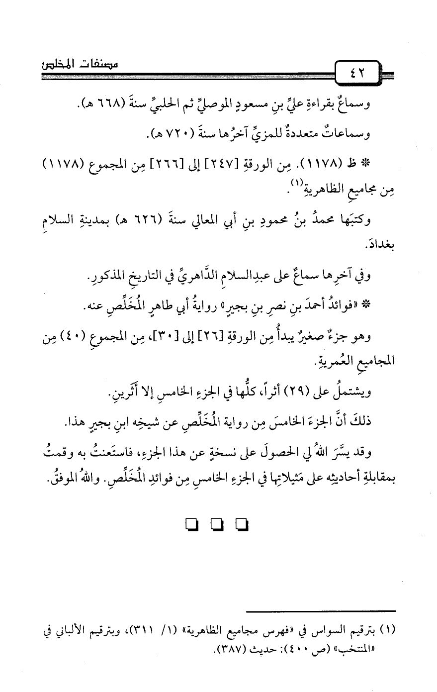 (¬1) بترقيم السواس في «فهرس مجاميع الظاهرية» (1/ 311) ، وبترقيم الألباني في «المنتخب» (ص 400) : حديث (387) .