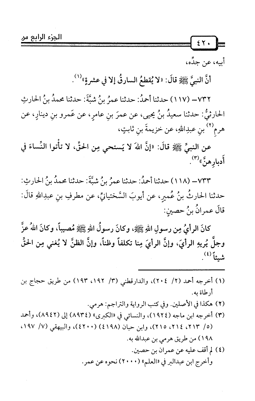 733- (118) حدثنا أحمدُ: حدثنا عمرُ بنُ شبَّةَ: حدثنا محمدُ بنُ الحارثِ: حدثنا الحارثُ بنُ عُميرٍ، عن أيوبَ السَّختيانيِّ، عن مطرفِ بنِ عبدِاللهِ قالَ: قالَ عمرانُ بنُ حصينٍ: