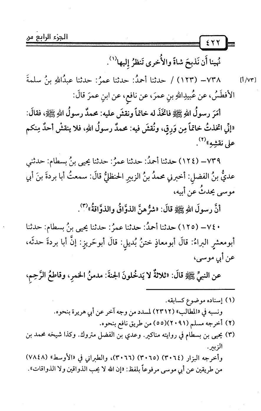 739- (124) حدثنا أحمدُ: حدثنا عمرُ: حدثنا يحيى بنُ بسطام: حدثني عديُّ بنُ الفضلِ: أخبرني محمدُ بنُ الزبيرِ الحنظليُّ قالَ: سمعتُ أبا بردةَ بنَ أبي موسى يحدثُ عن أبيه،