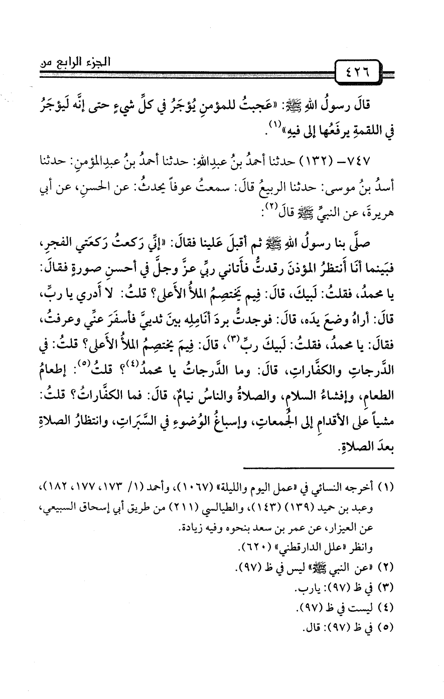 صلَّى بنا رسولُ اللهِ صلى الله عليه وسلم ثم أقبلَ عَلينا فقالَ: «إنِّي رَكعتُ رَكعَتي الفجرِ، فبَينما أنَا أَنتظرُ المؤذنَ رقدتُّ فأَتاني ربِّي عزَّ وجلَّ في أحسنِ صورةٍ فقالَ: يا محمدُ، فقلتُ: لَبيكَ، قالَ: فِيم يَختصِمُ الملأُ الأَعلى؟ قلتُ: لا أَدري يا ربِّ، قالَ: أراهُ وضعَ يدَه، قالَ: فوجدتُّ بردَ أنَامِلِه بينَ ثدييَّ فأسفَرَ عنِّي وعرفتُ، فقالَ: يا محمدُ، فقلتُ: لَبيكَ ربِّ (¬3) ، قالَ: فِيمَ يختصِمُ الملأُ الأَعلى؟ قلتُ: في الدَّرجاتِ والكفَّاراتِ، قالَ: وما الدَّرجاتُ يا محمدُ (¬4) ؟ قلتُ (¬5) : إطعامُ الطعامِ، وإفشاءُ السلامِ، والصلاةُ والناسُ نيامٌ، قالَ: فما الكفَّاراتُ؟ قلتُ: مشياً على الأقدامِ إلى الجُمعاتِ، وإسباغُ الوُضوءِ في السَّبَراتِ، وانتظارُ الصلاةِ بعدَ الصلاةِ.
