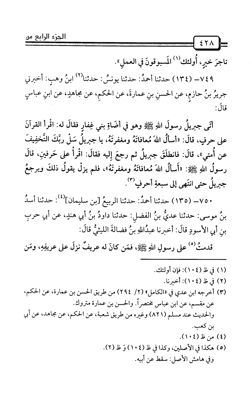 749- (134) حدثنا أحمدُ: حدثنا يونسُ: حدثنا (¬2) ابنُ وهبٍ: أخبرني جريرُ بنُ حازمٍ، عن الحسنِ بنِ عمارةَ، عن الحكمِ، عن مجاهدٍ، عن ابنِ عباسٍ قالَ: