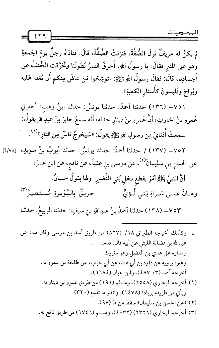752- (137) / حدثنا أحمدُ: حدثنا يونسُ: حدثنا أيوبُ بنُ سويدٍ، عن الحسنِ بنِ سليمانَ (¬2) ، عن موسى بنِ عقبةَ، عن نافعٍ، عن ابنِ عمرَ،