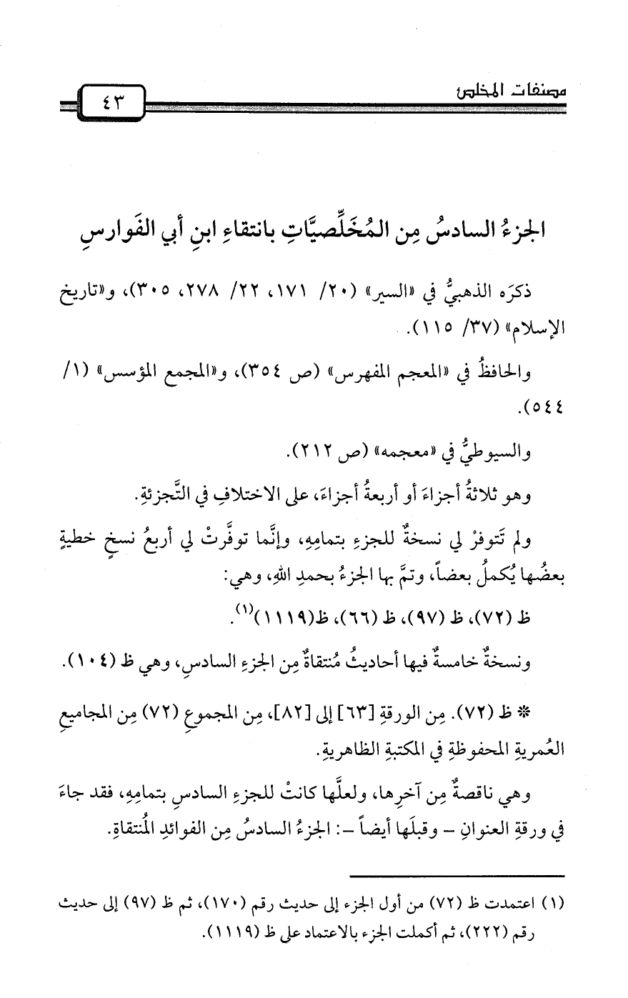 (¬1) اعتمدت ظ (72) من أول الجزء إلى حديث رقم (170) ، ثم ظ (97) إلى حديث رقم (222) ، ثم أكملت الجزء بالاعتماد على ظ (1119) .