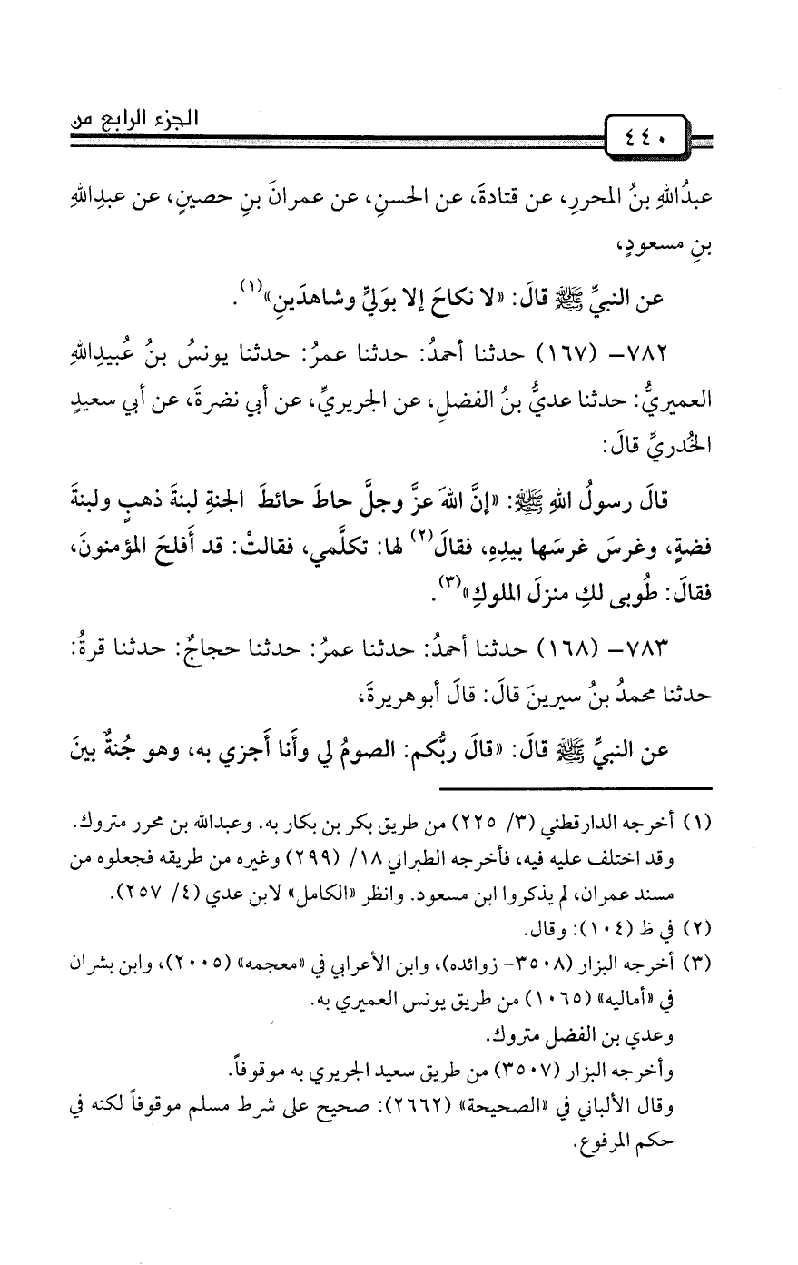 782- (167) حدثنا أحمدُ: حدثنا عمرُ: حدثنا يونسُ بنُ عُبيدِاللهِ العميريُّ: حدثنا عديُّ بنُ الفضلِ، عن الجريريِّ، عن أبي نضرةَ، عن أبي سعيدٍ الخُدريِّ قالَ: