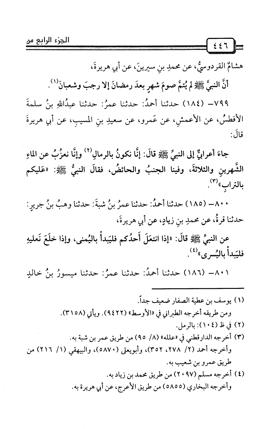 800- (185) حدثنا أحمدُ: حدثنا عمرُ بنُ شبةَ: حدثنا وهبُ بنُ جريرٍ: حدثنا قرةُ، عن محمدِ بنِ زيادٍ، عن أبي هريرةَ،