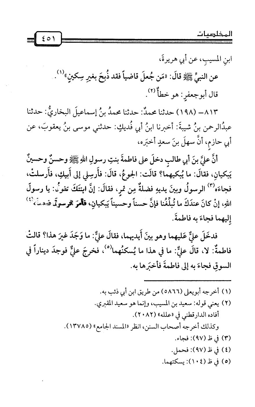 أنَّ عليَّ بنَ أبي طالبٍ دخلَ على فاطمةَ بنتِ رسولِ اللهِ صلى الله عليه وسلم وحسنٌ وحسينٌ يَبكيانِ، فقالَ: ما يُبكيهما؟ قالَت: الجوعُ، قالَ: فأَرسِلي إلى أَبيكِ، فأَرسلتْ، فجاءَه (¬3) الرسولُ وبينَ يديهِ فضلةٌ مِن تمرٍ، فقالَ: إنَّ ابنتَكَ تقولُ: يا رسولَ اللهِ، إنْ كانَ عندَكَ ما تُبلِّغُنا فإنَّ حسناً وحسيناً يَبكيانِ، فأمرَ الرسولَ فحملَه (¬4) إِليهما فجاءَ به فاطمةَ.