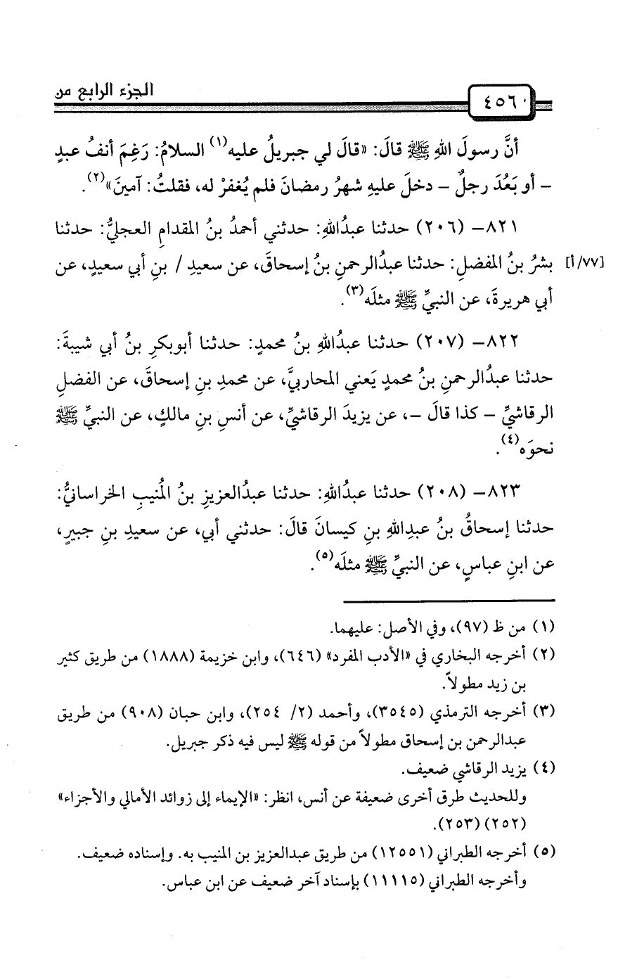 (¬3) أخرجه الترمذي (3545) ، وأحمد (2/ 254) ، وابن حبان (908) من طريق عبد الرحمن بن إسحاق مطولاً من قوله صلى الله عليه وسلم ليس فيه ذكر جبريل.