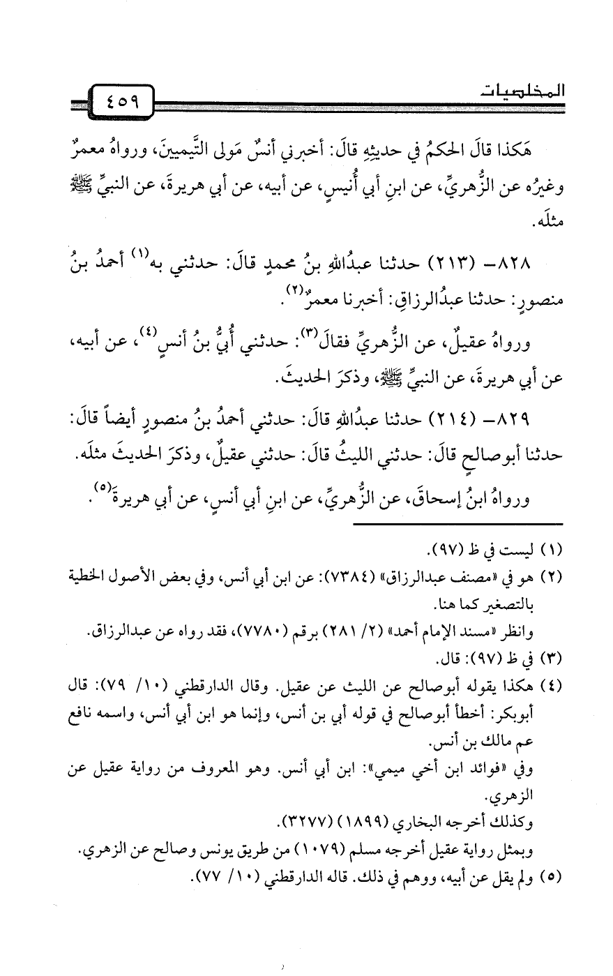 828- (213) حدثنا عبدُاللهِ بنُ محمدٍ قالَ: حدثني به (¬1) أحمدُ بنُ منصورٍ: حدثنا عبدُالرزاقِ: أخبرنا معمرٌ (¬2) .