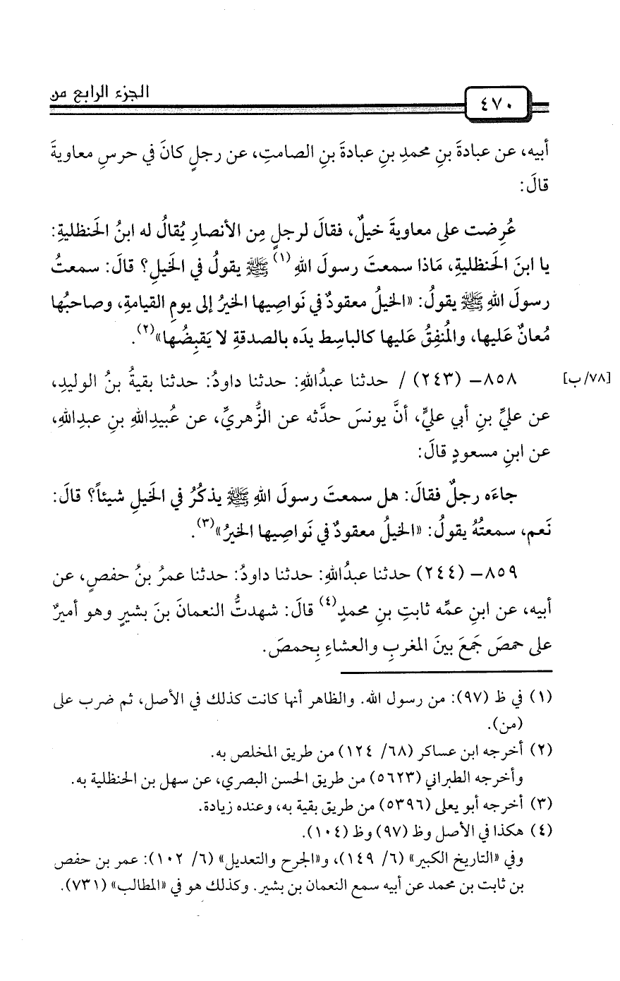 عُرِضت على معاويةَ خيلٌ، فقالَ لرجلٍ مِن الأنصارِ يُقالُ له ابنُ الحَنظليةِ: يا ابنَ الحَنظليةِ، مَاذا سمعتَ رسولَ اللهِ (¬1) صلى الله عليه وسلم يقولُ في الخَيلِ؟ قالَ: سمعتُ رسولَ اللهِ صلى الله عليه وسلم يقولُ: «الخيلُ معقودٌ في نَواصِيها الخيرُ إلى يومِ القيامةِ، وصاحبُها مُعانٌ عَليها، والمُنفِقُ عَليها كالباسِط يدَه بالصدقةِ لا يَقبِضُها» (¬2) .