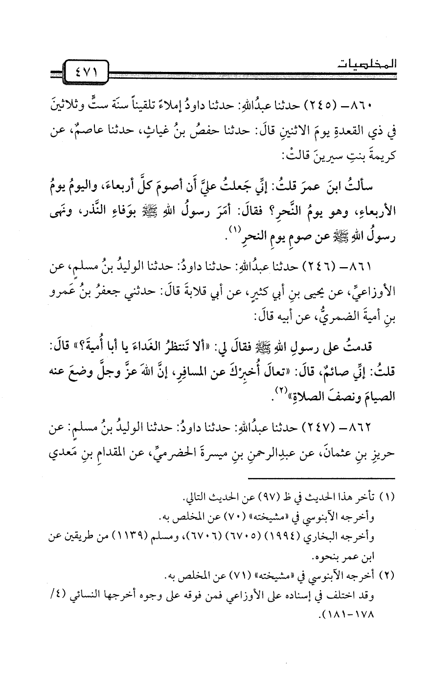 860- (245) حدثنا عبدُاللهِ: حدثنا داودُ إملاءً تلقيناً سنَة ستٍّ وثلاثينَ في ذي القعدةِ يومَ الاثنينِ قالَ: حدثنا حفصُ بنُ غياثٍ، حدثنا عاصمٌ، عن كريمةَ بنتِ سيرينَ قالتْ: