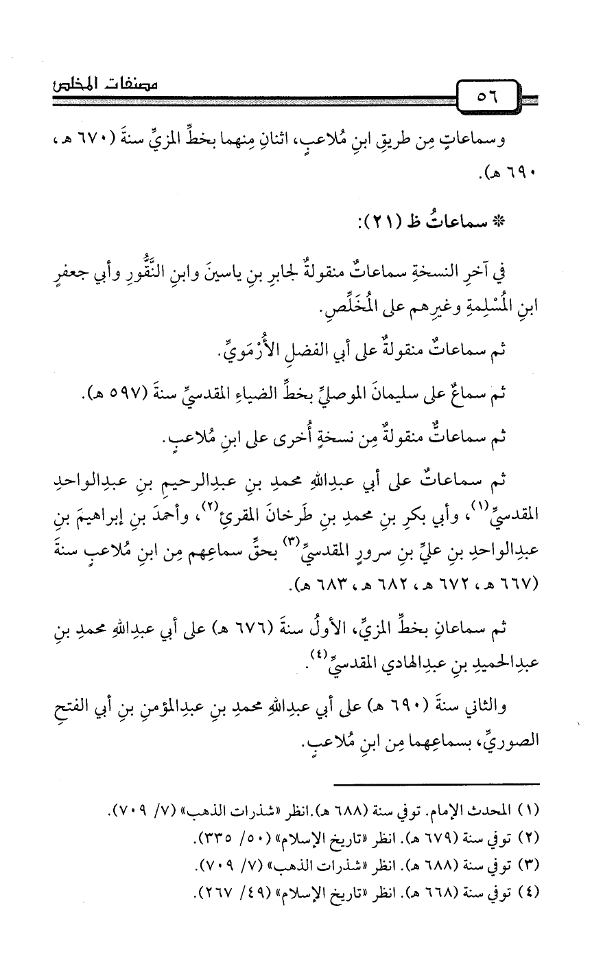 ثم سماعاتٌ على أبي عبدِاللهِ محمدِ بنِ عبدِالرحيمِ بنِ عبدِالواحدِ المقدسيِّ (¬1) ، وأبي بكرِ بنِ محمدِ بنِ طَرخانَ المقرئِ (¬2) ، وأحمدَ بنِ إبراهيمَ بنِ عبدِالواحدِ بنِ عليِّ بنِ سرورٍ المقدسيِّ (¬3) بحقِّ سماعِهم مِن ابنِ مُلاعبٍ سنةَ (667 هـ، 672 هـ، 682 هـ، 683 هـ) .