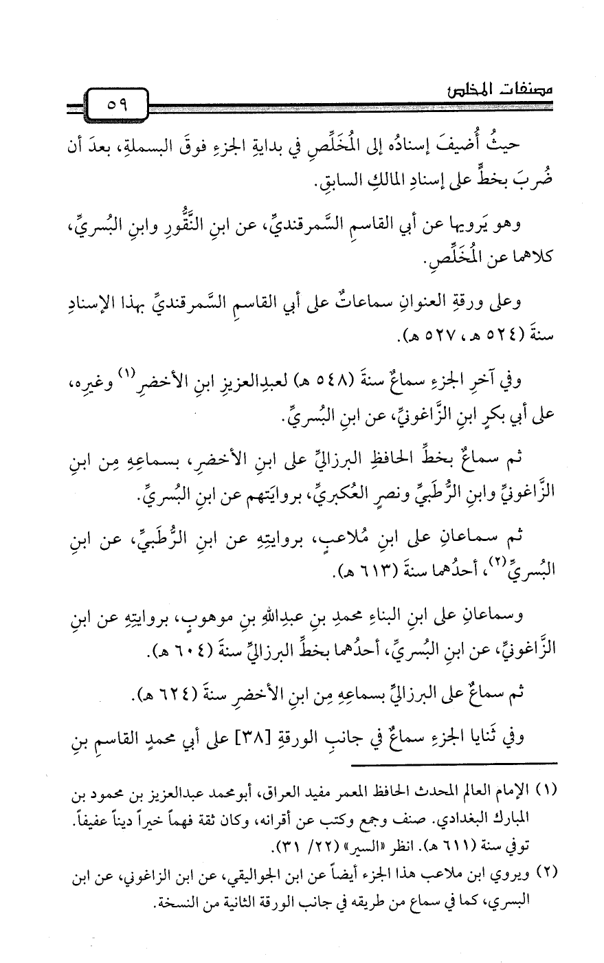 (¬2) ويروي ابن ملاعب هذا الجزء أيضاً عن ابن الجواليقي، عن ابن الزاغوني، عن ابن البسري، كما في سماع من طريقه في جانب الورقة الثانية من النسخة.