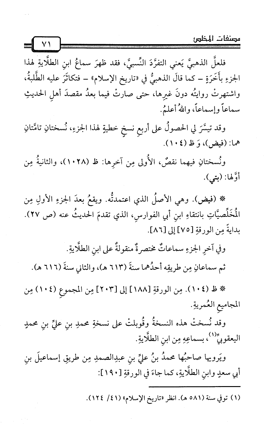 وقد نُسختْ هذه النسخةُ وقُوبلتْ على نسخةِ محمدِ بنِ عليِّ بنِ محمدٍ اليعقوبيِّ (¬1) ، بسماعِهِ مِن ابنِ الطلَّايةِ.