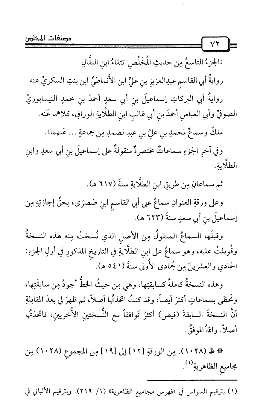 (¬1) بترقيم السواس في «فهرس مجاميع الظاهرية» (1/ 219) . وبترقيم الألباني في «المنتخب» (ص 401) : حديث (237) .