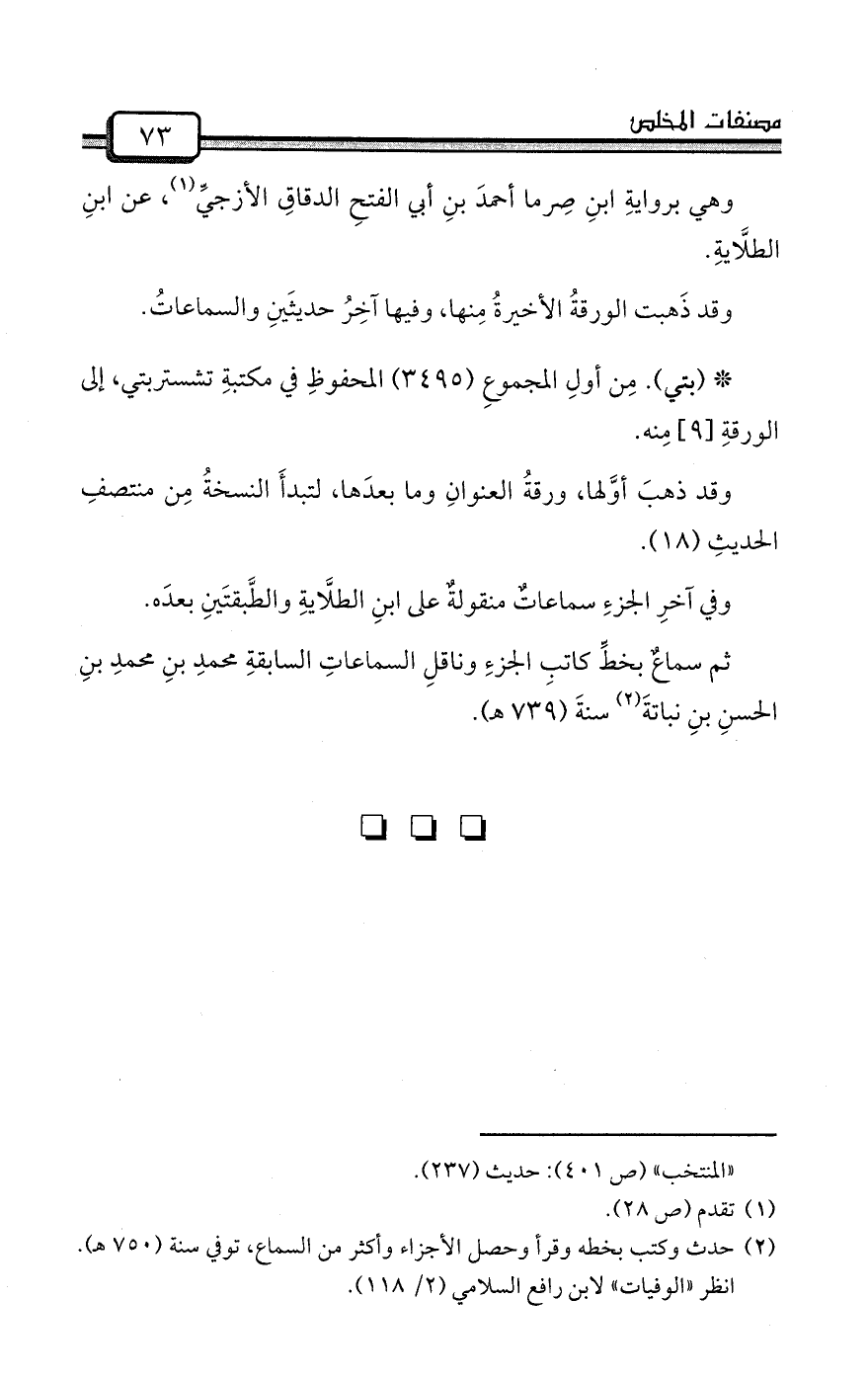 ثم سماعٌ بخطِّ كاتبِ الجزءِ وناقلِ السماعاتِ السابقةِ محمدِ بنِ محمدِ بنِ الحسنِ بنِ نباتةَ (¬2) سنةَ (739 هـ) .